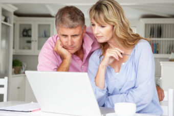 Mid age couple working at home on laptop
