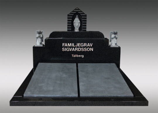 Monument Framsida: polerad Sidytor: polerade Baksida: polerad Plattor för text: mattslipade med polerade stödsidor Skulpturer, ängel och Maria: mattslipade med polerade detaljer
