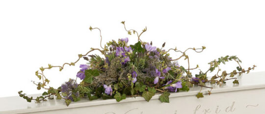 Kistdekoration med lila blommor och slingrande gröna rankor.