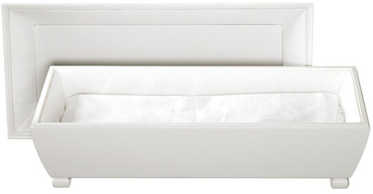 Kista av massiv furu med bottenplatta av spånskiva. Vitmålad. Lockplatta försedd med linnetyg, finns i färgerna vitt och limegrönt.