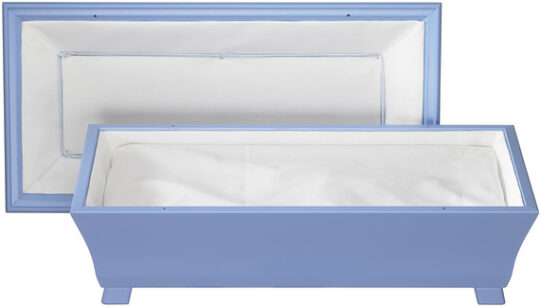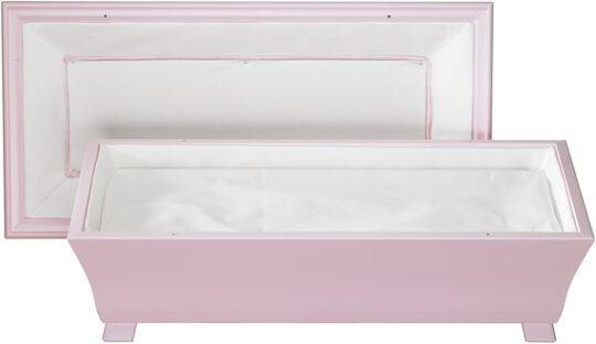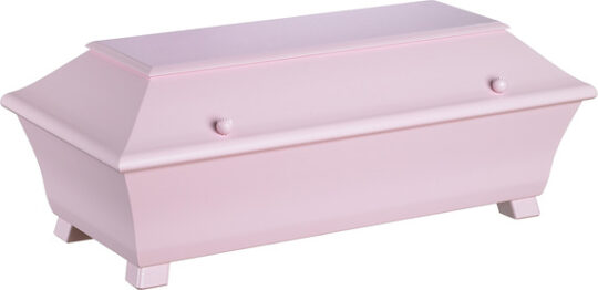 Kista av massiv furu med bottenplatta av spånskiva. Finns i färgerna vit, rosa och blått. Exteriörens färg återkommer i kistans inredning i form av dekorband på lockklädsel. Kudde och täcke går att få som tillval.