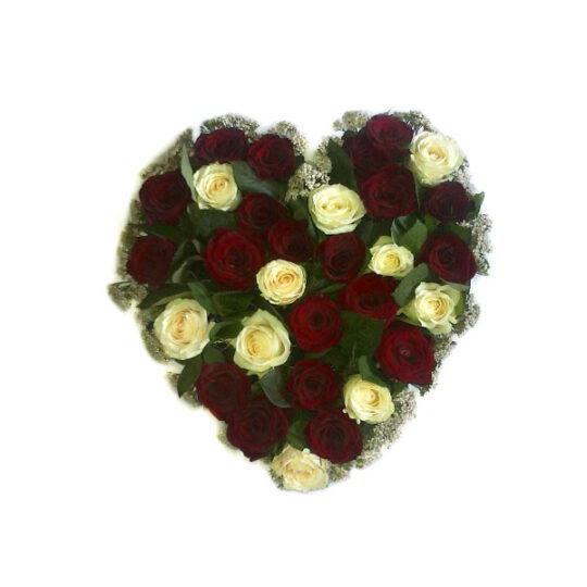 Låg sorgdekoration i form av ett hjärta, med röda och vita rosor som smyckas runt om med limonium/brudslöja efter säsong.
