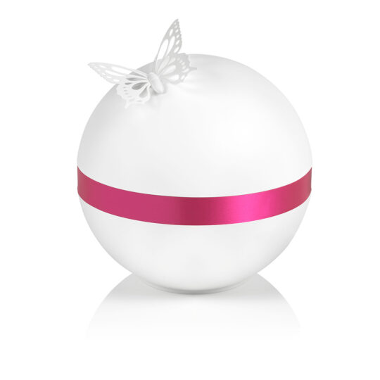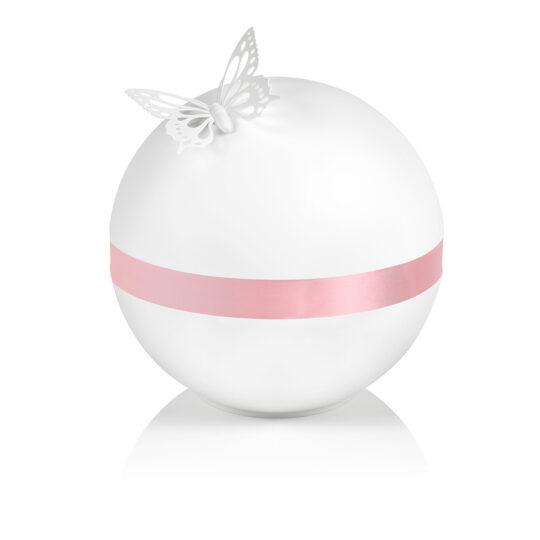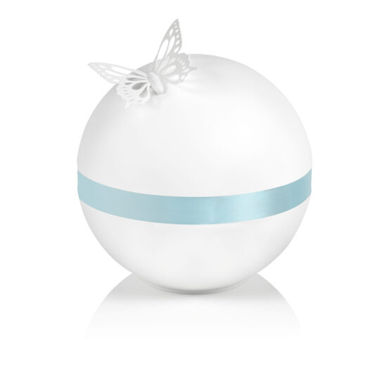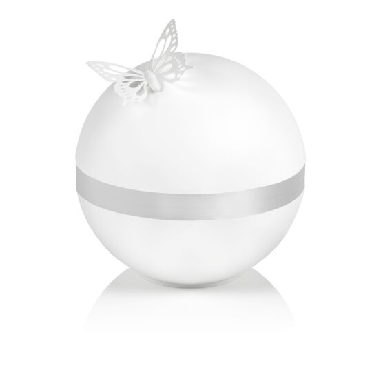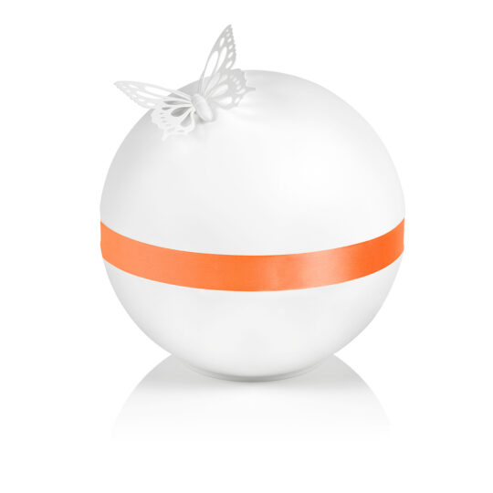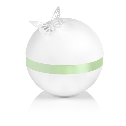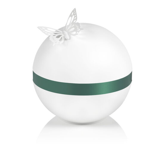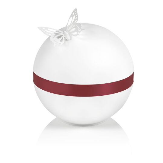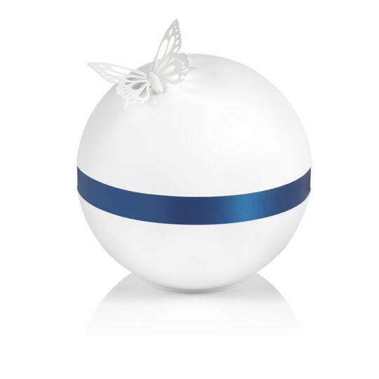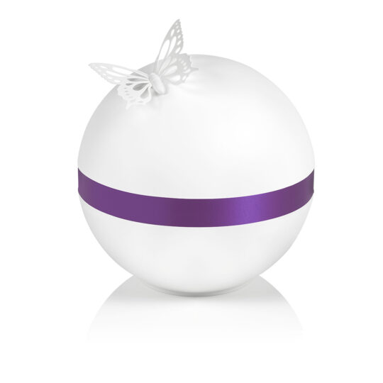 Klotformad urna i 100 % biologiskt nedbrytbar PLA. Du kan välja mellan flera olika färger på bandet. Du kan själv välja text och typsnitt på bandet. Fjäril samt nedsänkningsband medföljer.